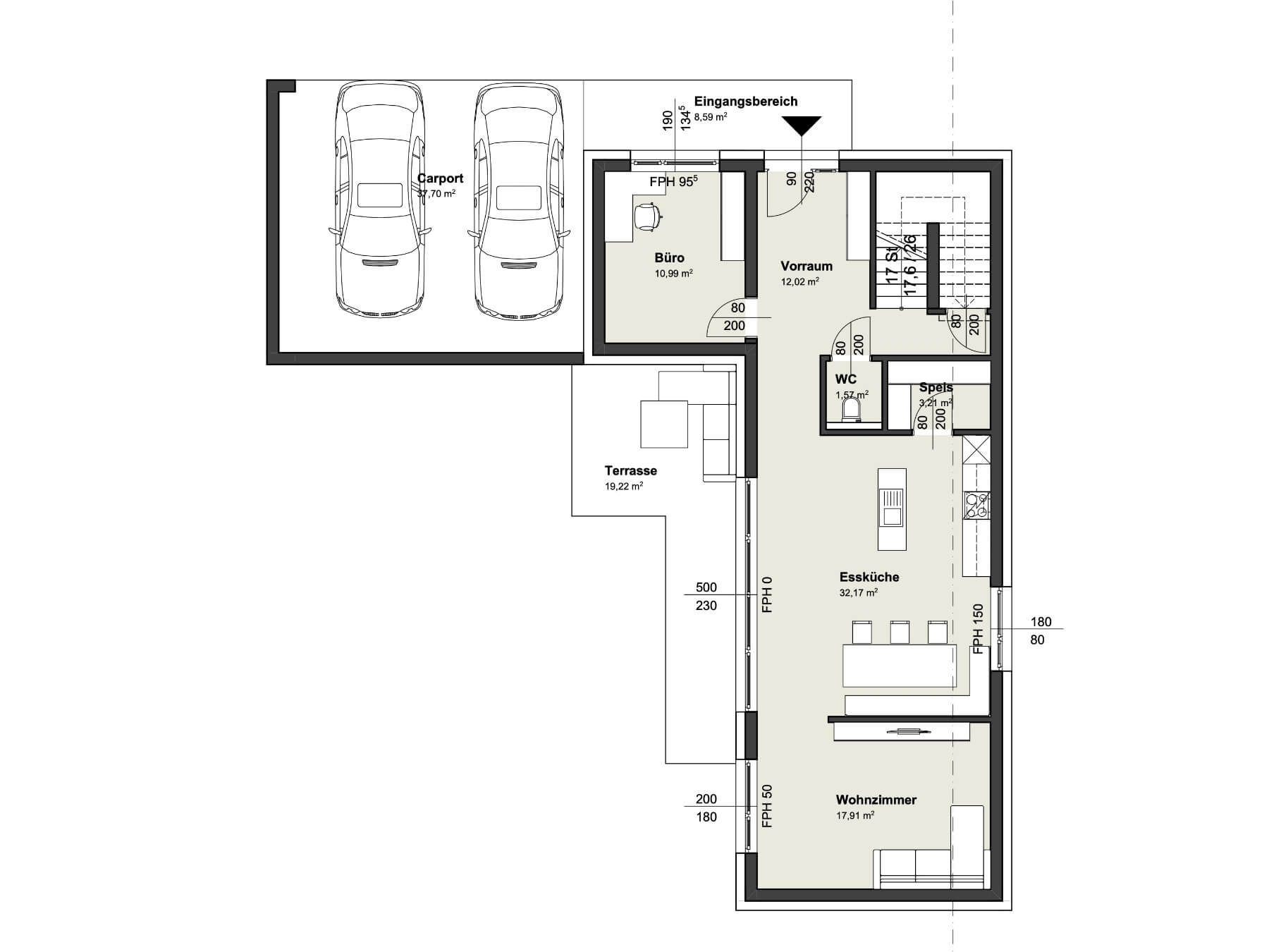• Offener-WEK-Bereich 50 m² inkl. Vorratsraum 3,2 m²